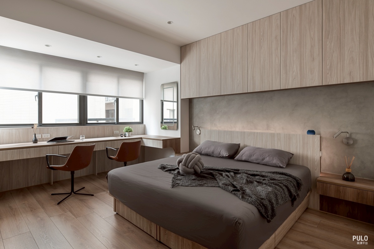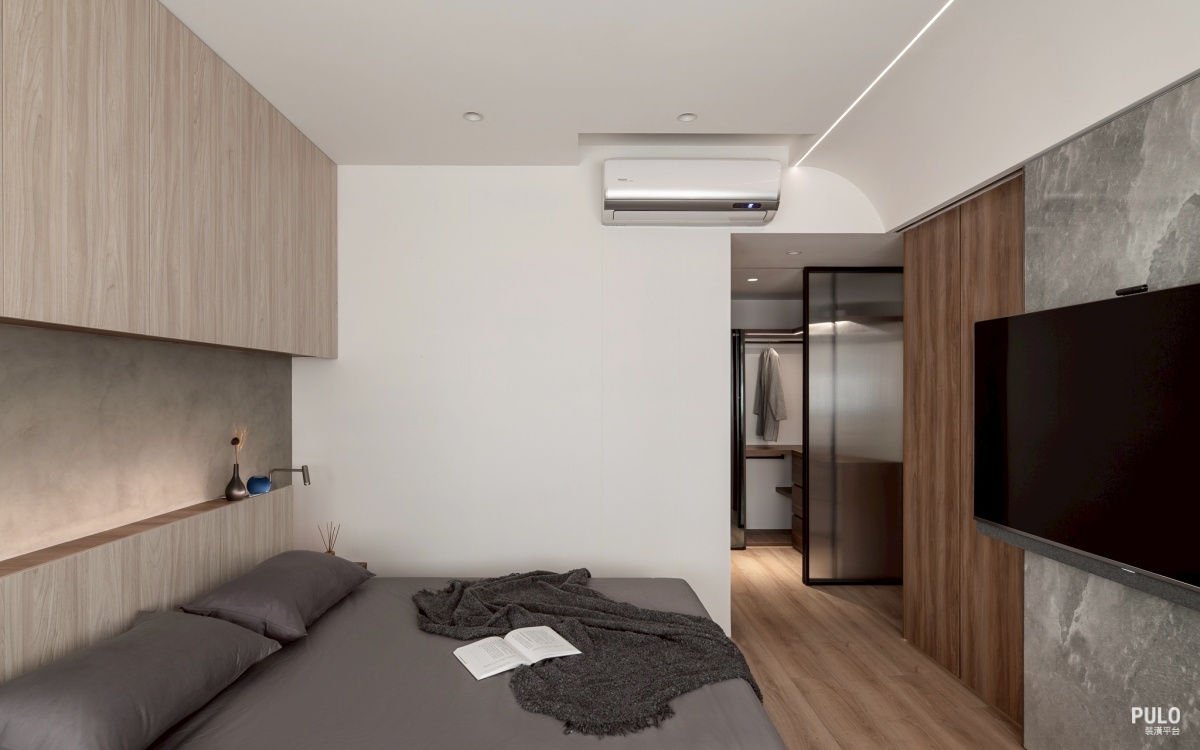 臥室 主臥室延續了公領域的色彩,微水泥質感的床頭牆面配上間接光線,讓睡眠環境變得更沉 靜感。並將電視牆改為移動壁掛,牆面後方增加了成排的收納設計,提供更大量的儲藏空 間。