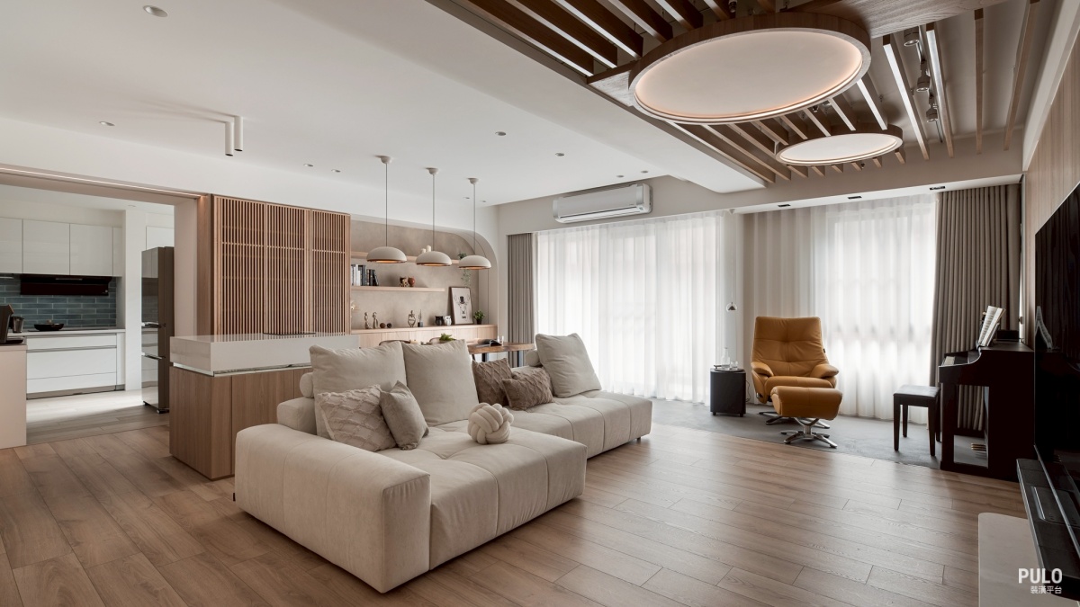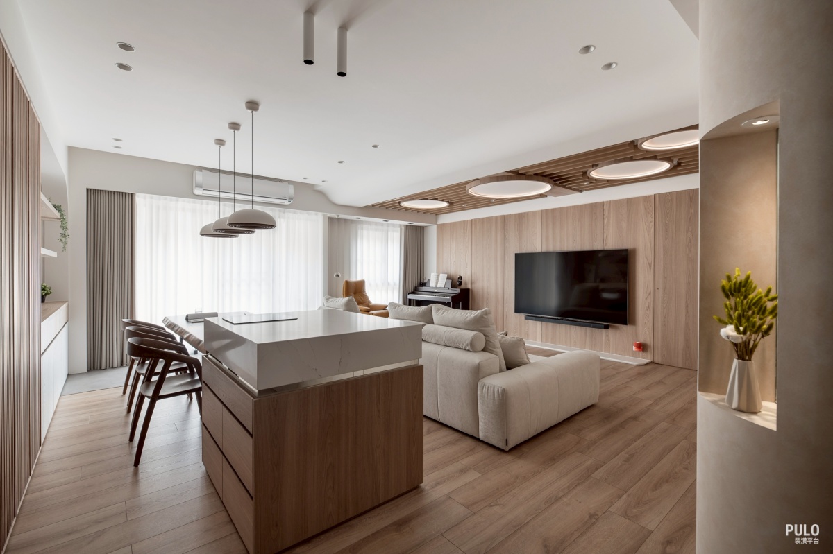 除了視覺上更純淨,最重要的是讓掃地機器人可以全屋跑透透,長輩行走時也不必擔心踢 到東西,打造出一個無障礙空間。 客廳:大片自然紋理和智慧家居 走進客廳,電視牆選用了溫潤的木紋材質,一直延伸到天花板上的木質格柵,把原本零碎 的樑柱修飾掉。
