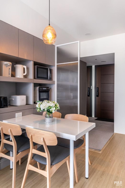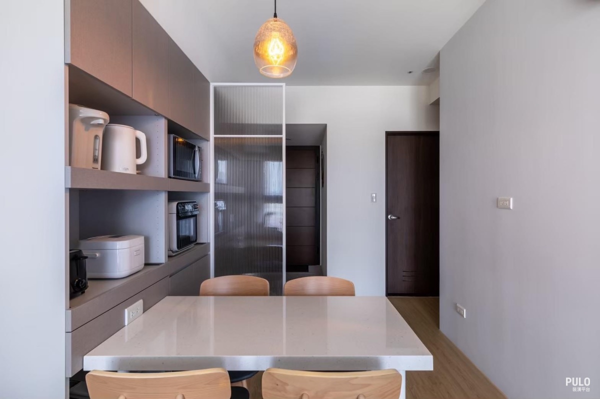 餐桌就放在電器櫃旁邊,縮短了拿東西或端菜的動線,讓這區域在視覺上更乾淨俐落。
