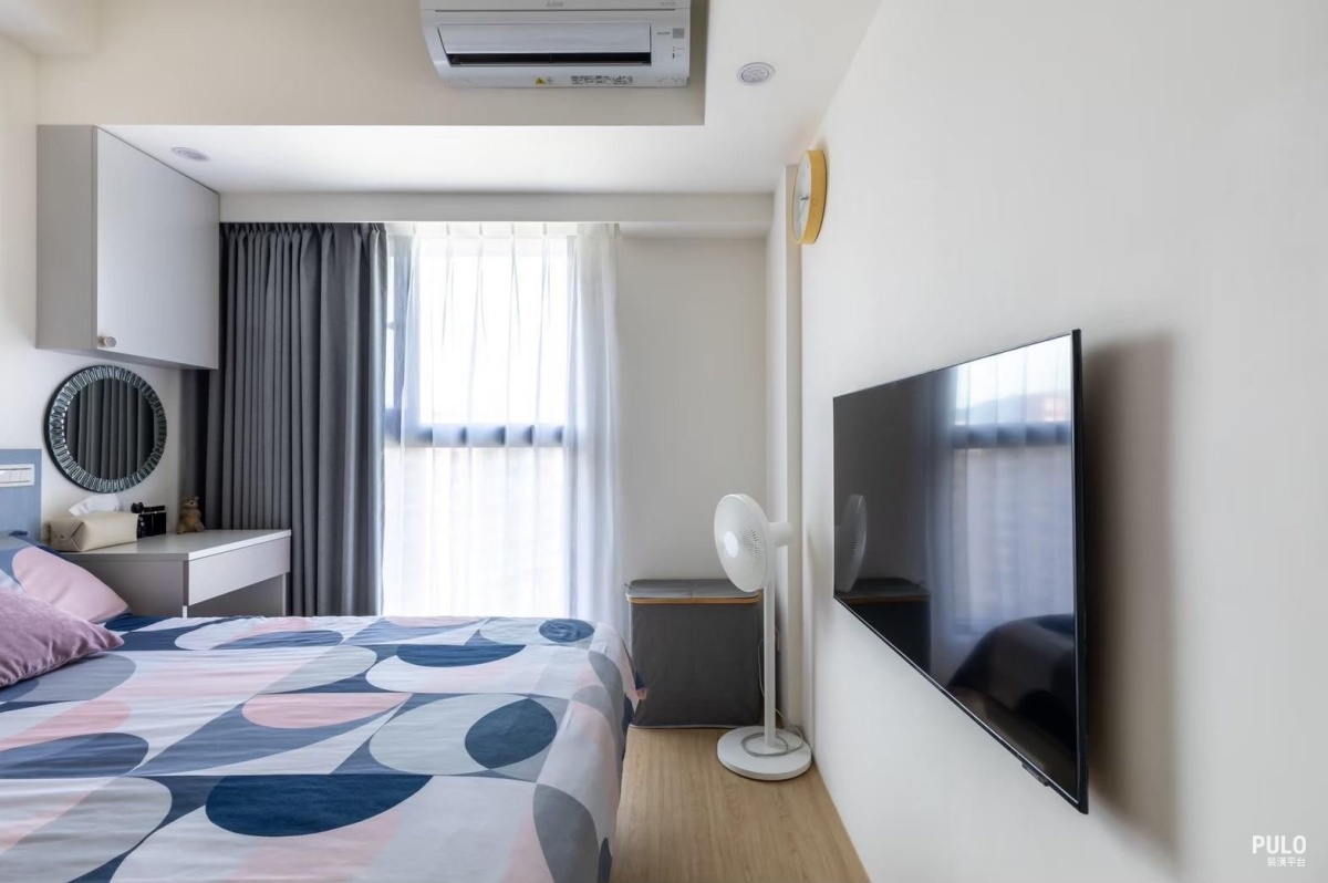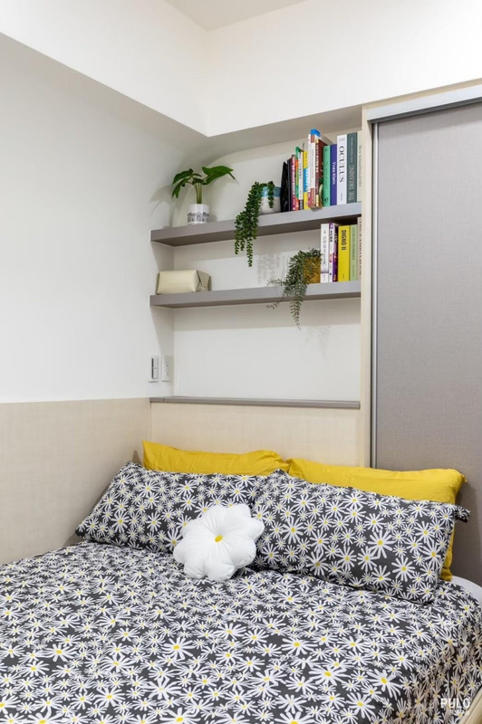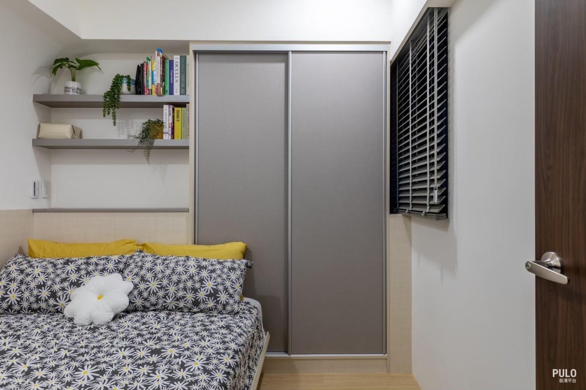 次臥則利用有限的空間設置收納櫃,並搭配層板和床頭設計,在維持整齊的同時,也把收 納空間發揮到最大。