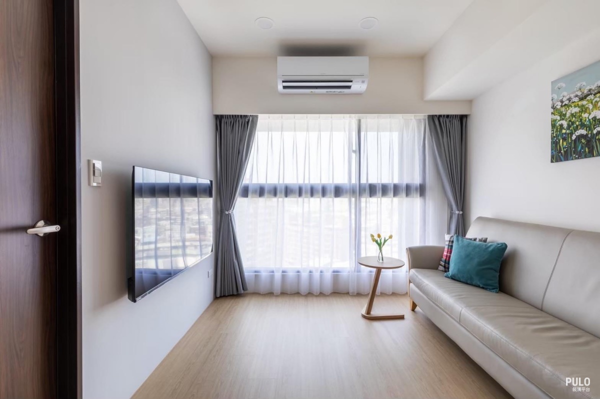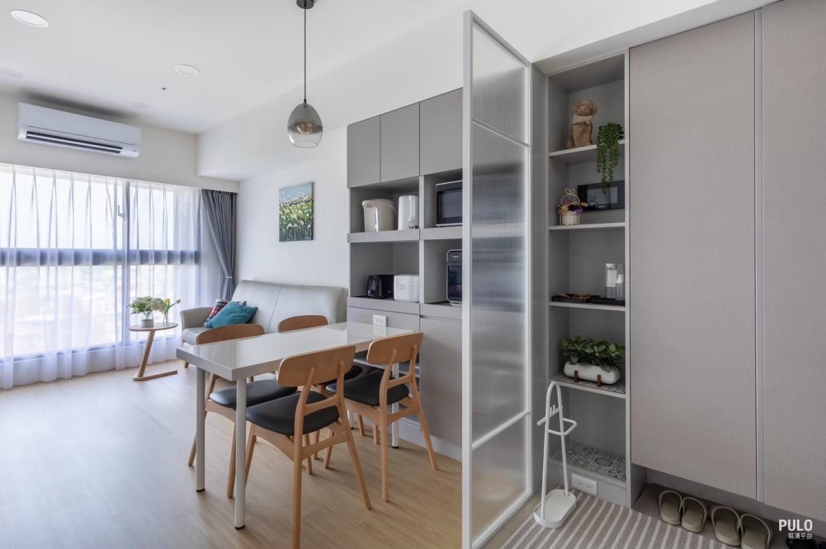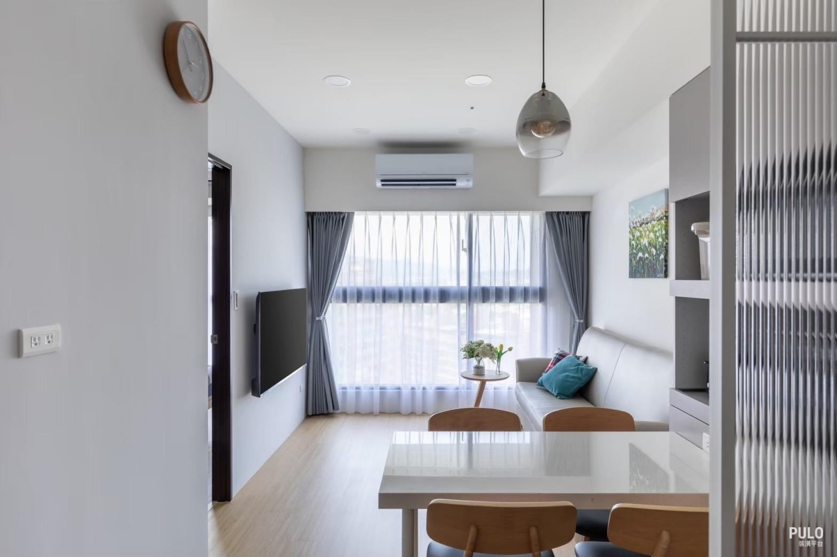 以白色與淺灰色為基本色調,利用 SPC 木地板的鋪設與玄關的長虹玻璃屏風,讓空間動 線在分區的同時,依然能擁有通透的採光效果。