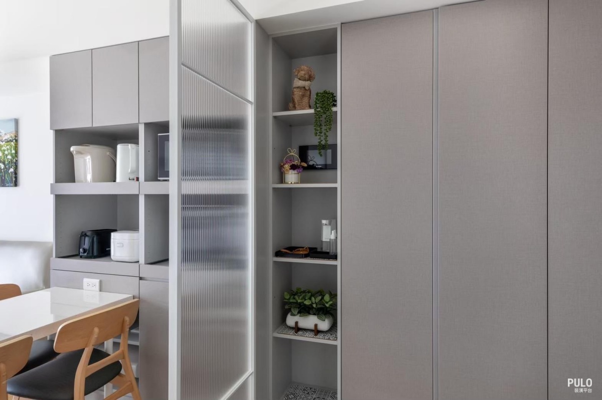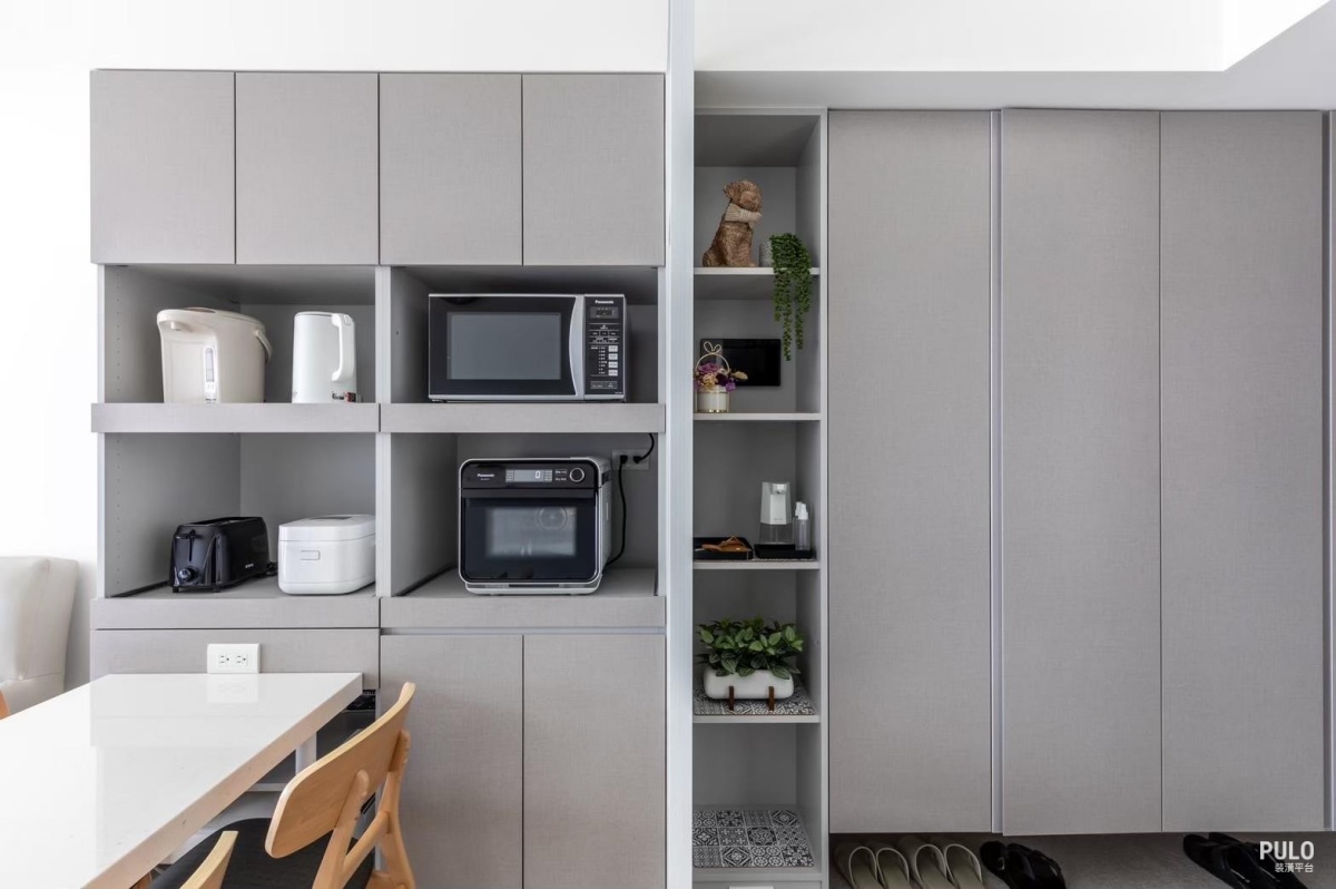 電視牆省掉電視櫃、保持留白,並選用跳色油漆刷出視覺重點,除了不會影響空間使用, 也能在預算內幫簡約的客廳增加一點變化。 整合家電的收納櫃 灰色系的系統櫃體整合了電器櫃與儲物功能,開放式的格位規劃方便擺放微波爐、熱水壺 等常用小家電,並預留了專用電源,用電更安全。