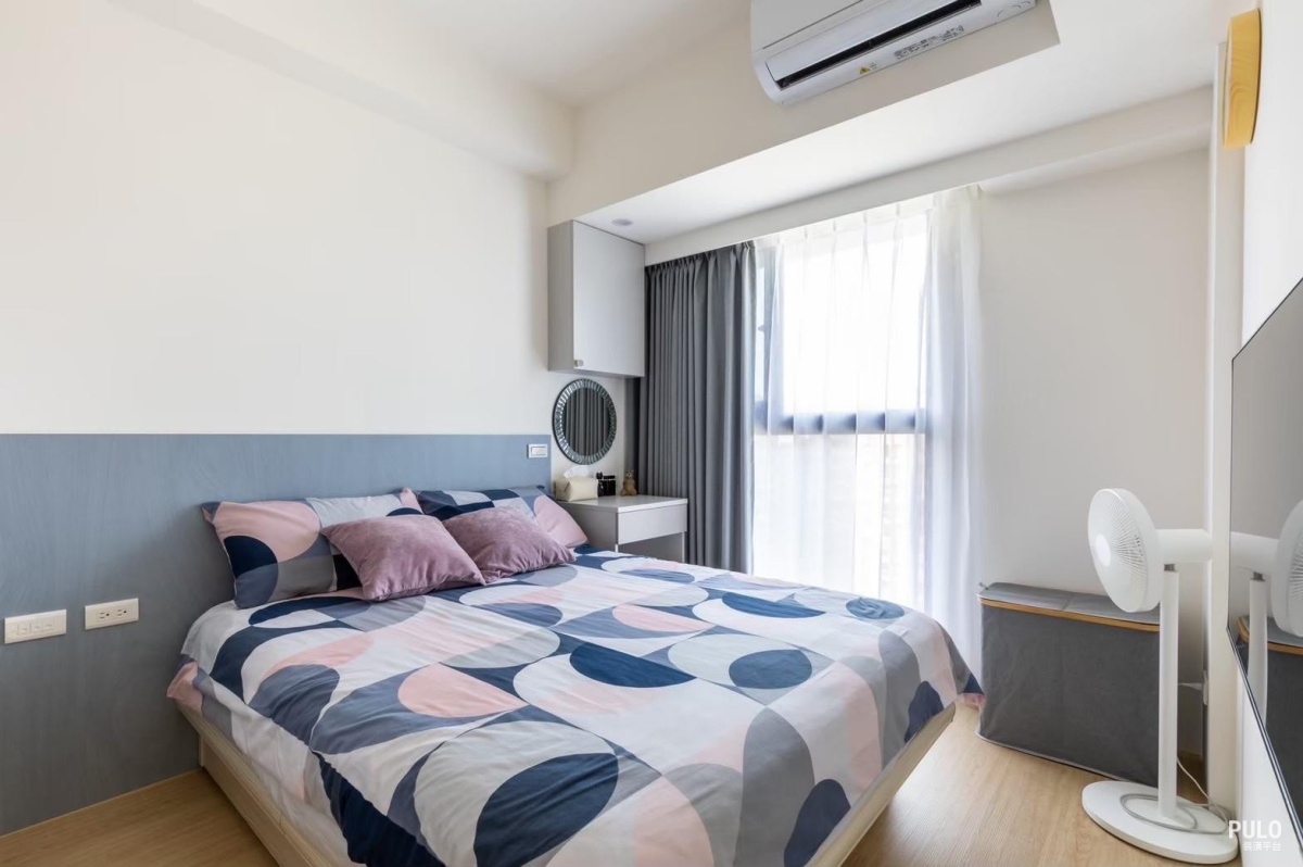 臥室:配色與空間利用 主臥室床頭選用灰藍色,配上淺色木地板,設計出適合睡眠的冷靜氛圍。