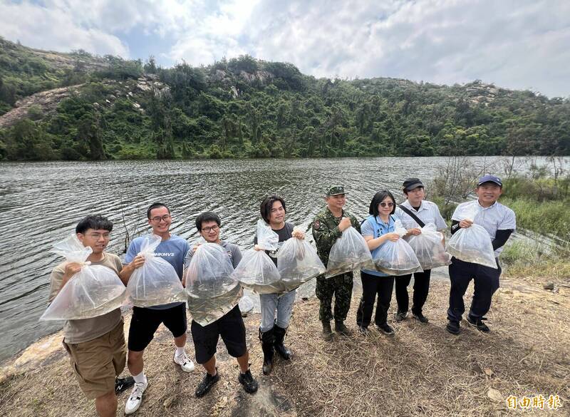 金門縣政府今天在軍事管制區擎天水庫辦理國家3級保育類淡水魚種「大鱗梅氏鯿」野放