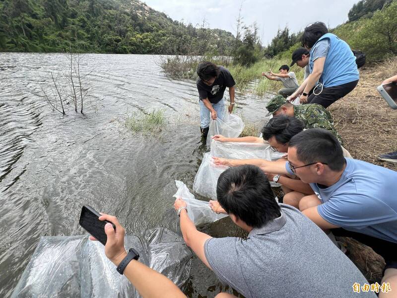 金門軍民攜手野放大鱗梅氏鯿等魚種。(記者吳正庭攝)