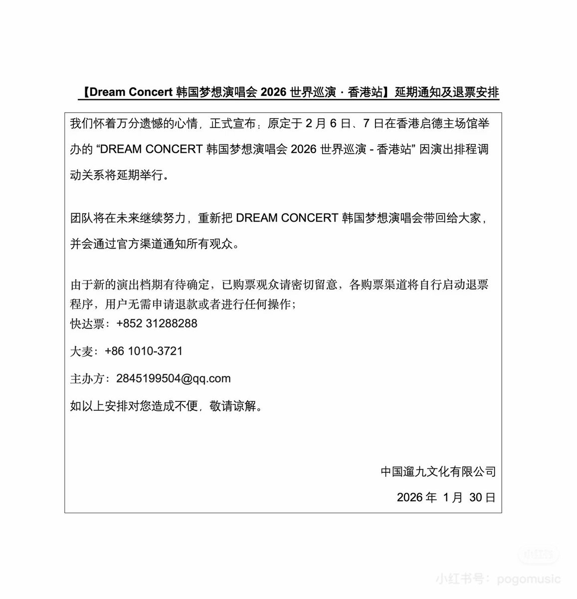 原定於2月6日7日在香港舉辦的'Dream Concert韓國夢想演唱會2026 世界巡演 - 香港站'