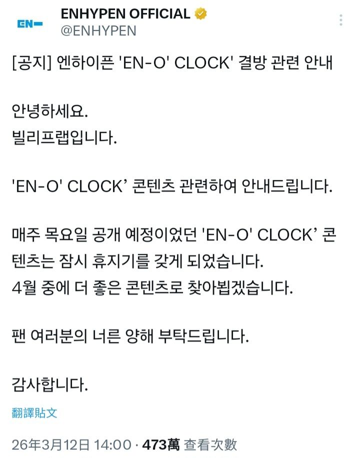@Hforhypen表示:「羲承突然離開ENHYPEN讓許多粉絲心碎。