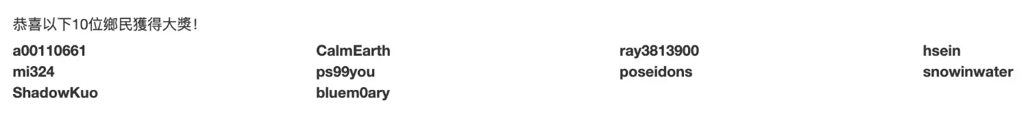 恭喜以下10位鄉民獲得 1000 P