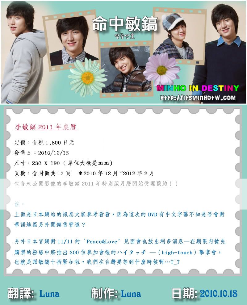 : 從2010年12月開始到2010年2月為止,充滿李敏鎬未公開照片的Calendar開始預約囉。