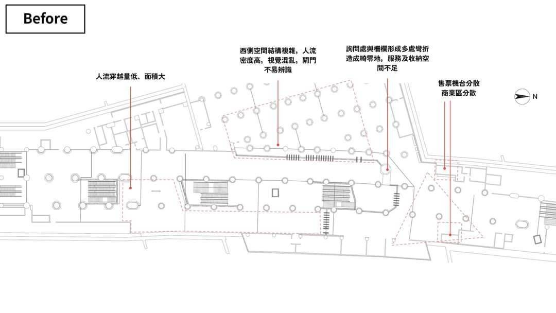 此外,舊設計未將柱體視為管制界線,結果就是兩邊出站的旅客視覺都會被柱子給檔到