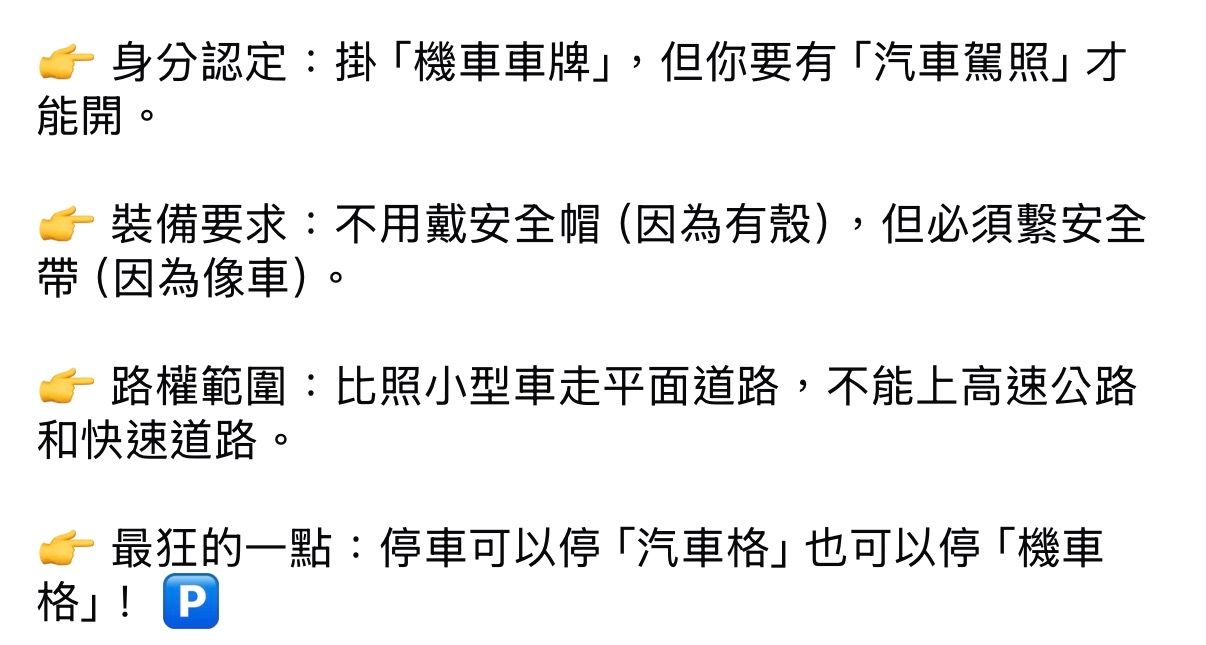 三輪式機車,為其建立明確定位,並正式命名為「駕艙機車」,預告期60天,後續程序若