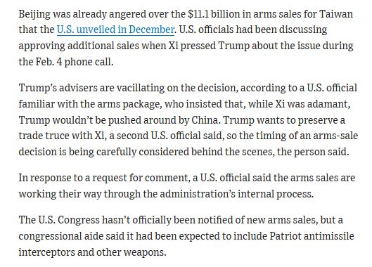 在討論批准額外軍售時,習近平在2月4日的電話中向川普施壓。