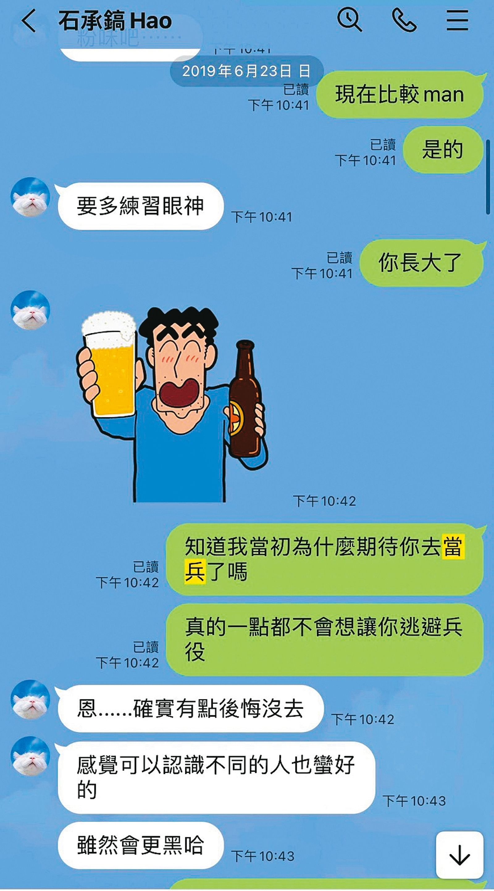 示:「知道我當初為什麼期待你去當兵了嗎?」「真的一點都不會想讓你逃避兵役。」而