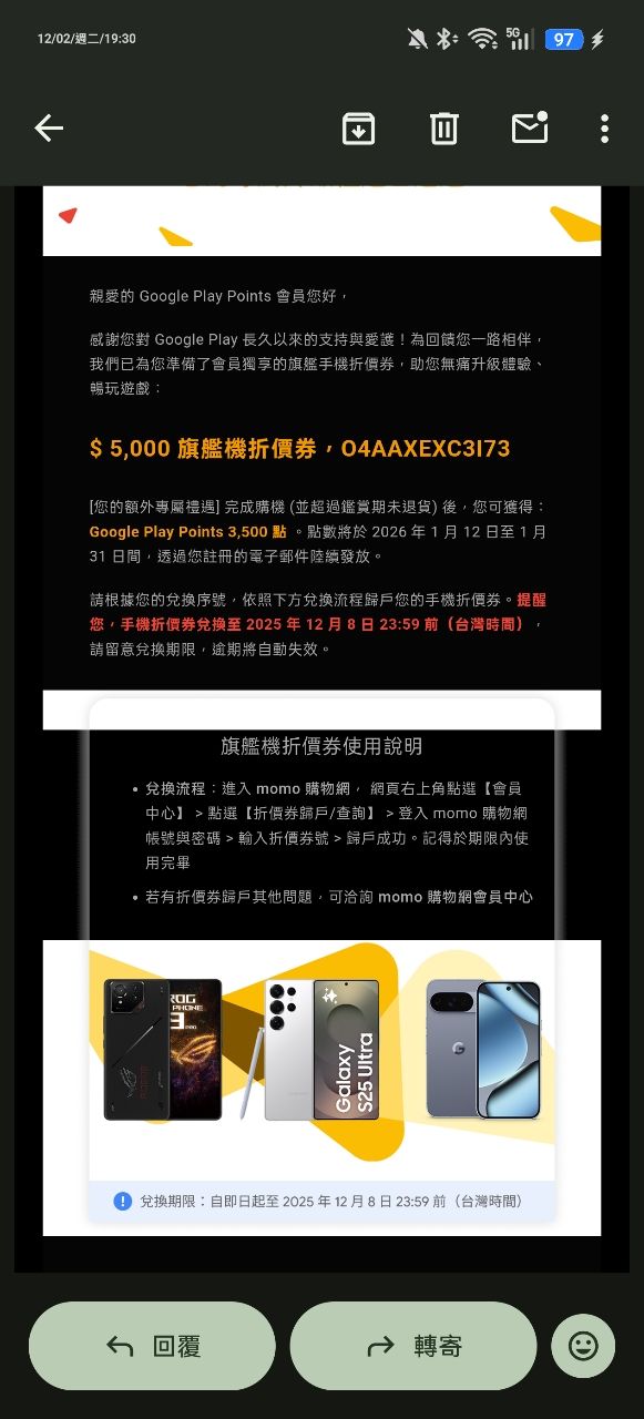 484F:推 shijh : $ 5,000 旗艦機折價券,E4AAXEXC3973 12月8日到期 12/03 01:00