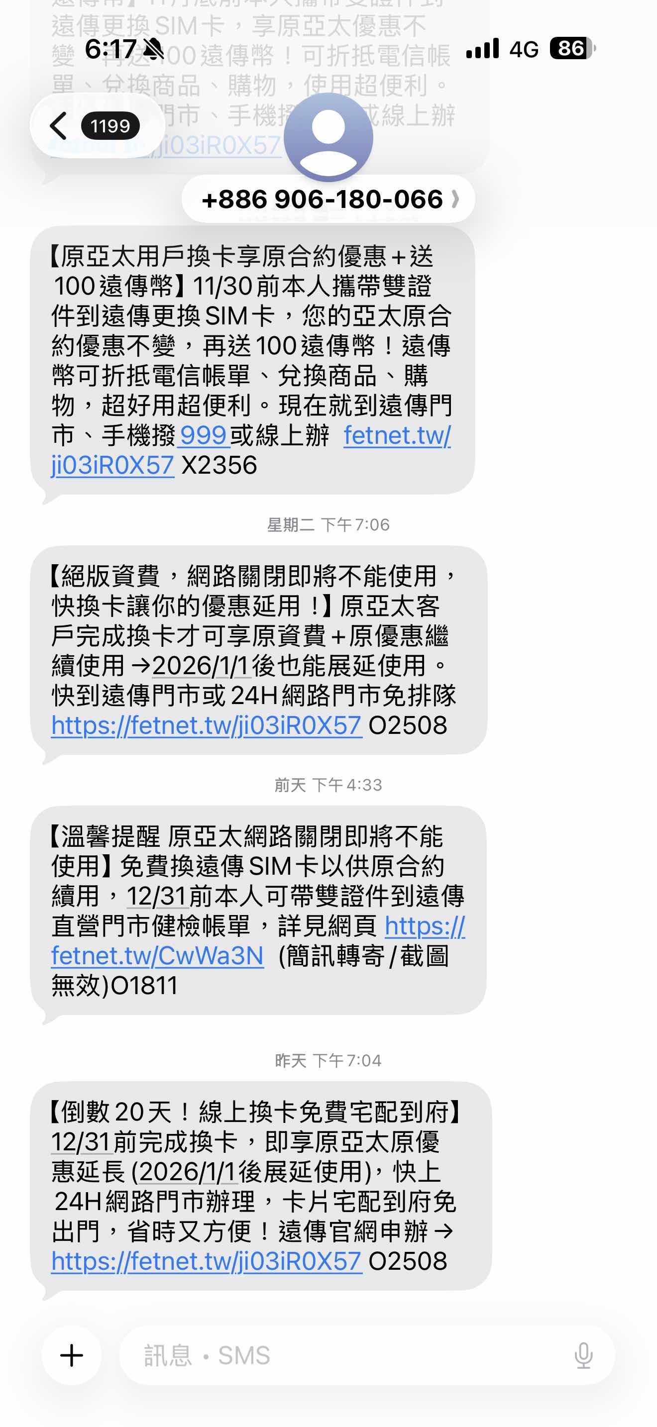 最近收到遠傳不同意思的各個簡訊(遠傳三不五時傳過來,我按順序選最近傳來的三則)