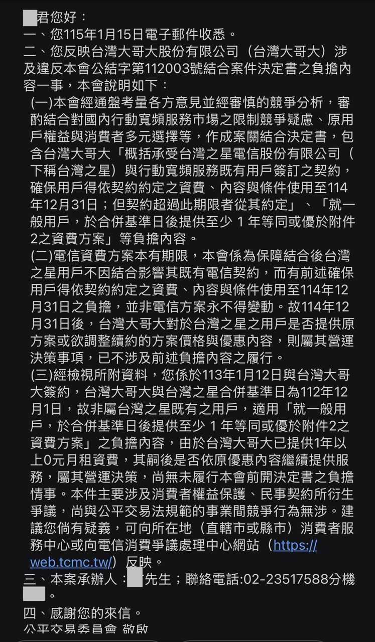 貴會於 112 年之許可處分,旨在維持市場資費多樣性並保障消費者權益。雖保障期限至