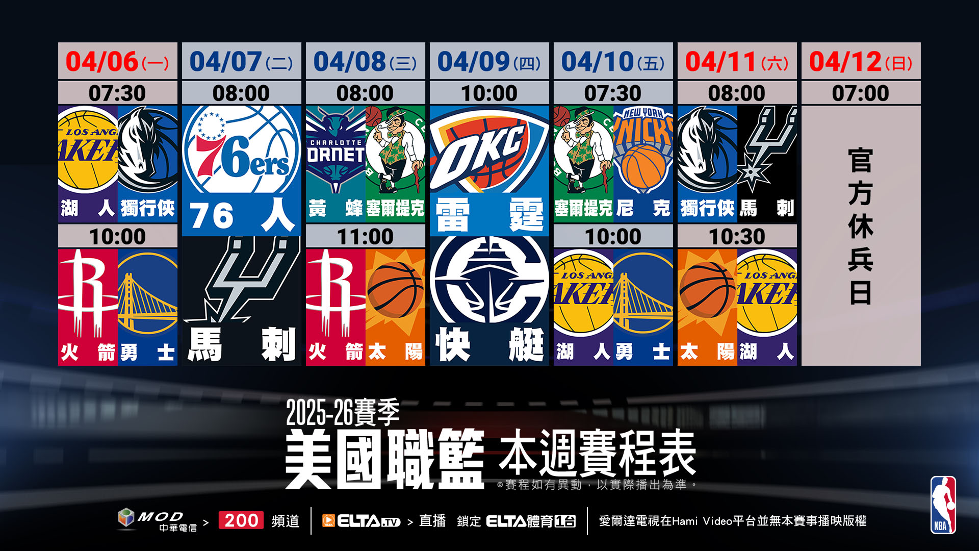 │ 2025-26 例行賽 (台灣時間) ESPN NBC Amazon Taiwan 愛爾達 緯來 Hami │