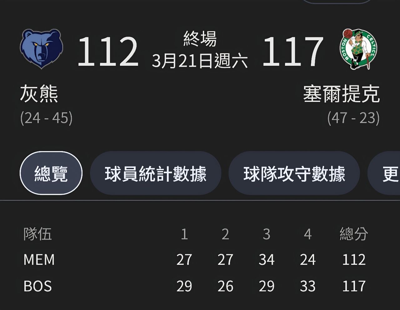 136F:→ luke417 : 例如圖上那場,灰熊前三節打完還領先綠賽,所以...? 04/04 16:48