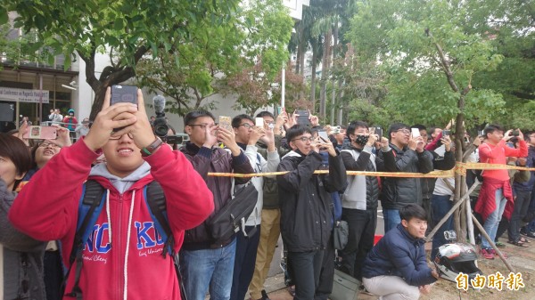 影出現在天空,學生們立即拿起手機錄影。(記者劉婉君攝)