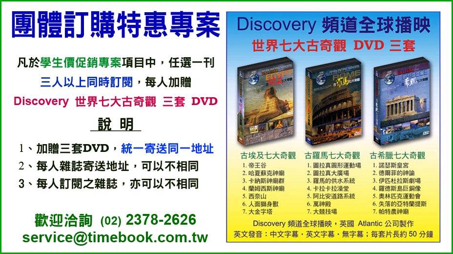凡三人以上同時訂閱,每人加贈:Discovery 世界七大古奇觀三套DVD