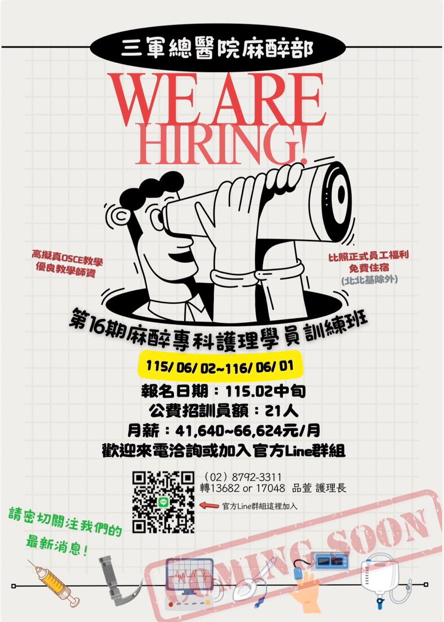 三軍總醫院第16期麻醉學員 訓練班-招生預告