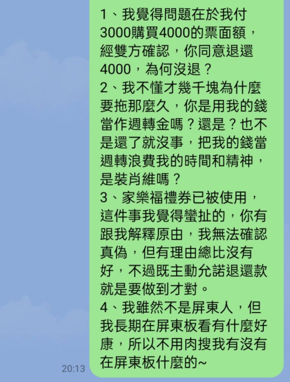 3.針對金額部份,申訴方有提供zack60407版友於今日凌晨3時的退款證明,由於申訴方在