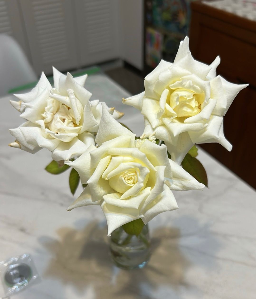 白色香水玫瑰,超級香,很幸運可以ㄧ次開三朵,盛開時整個花朵超過10公分,很美。