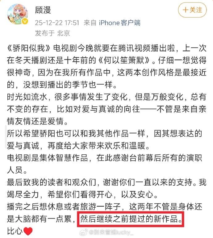 是顧漫老師最後一部現偶劇」,此話一出立即外界熱議。