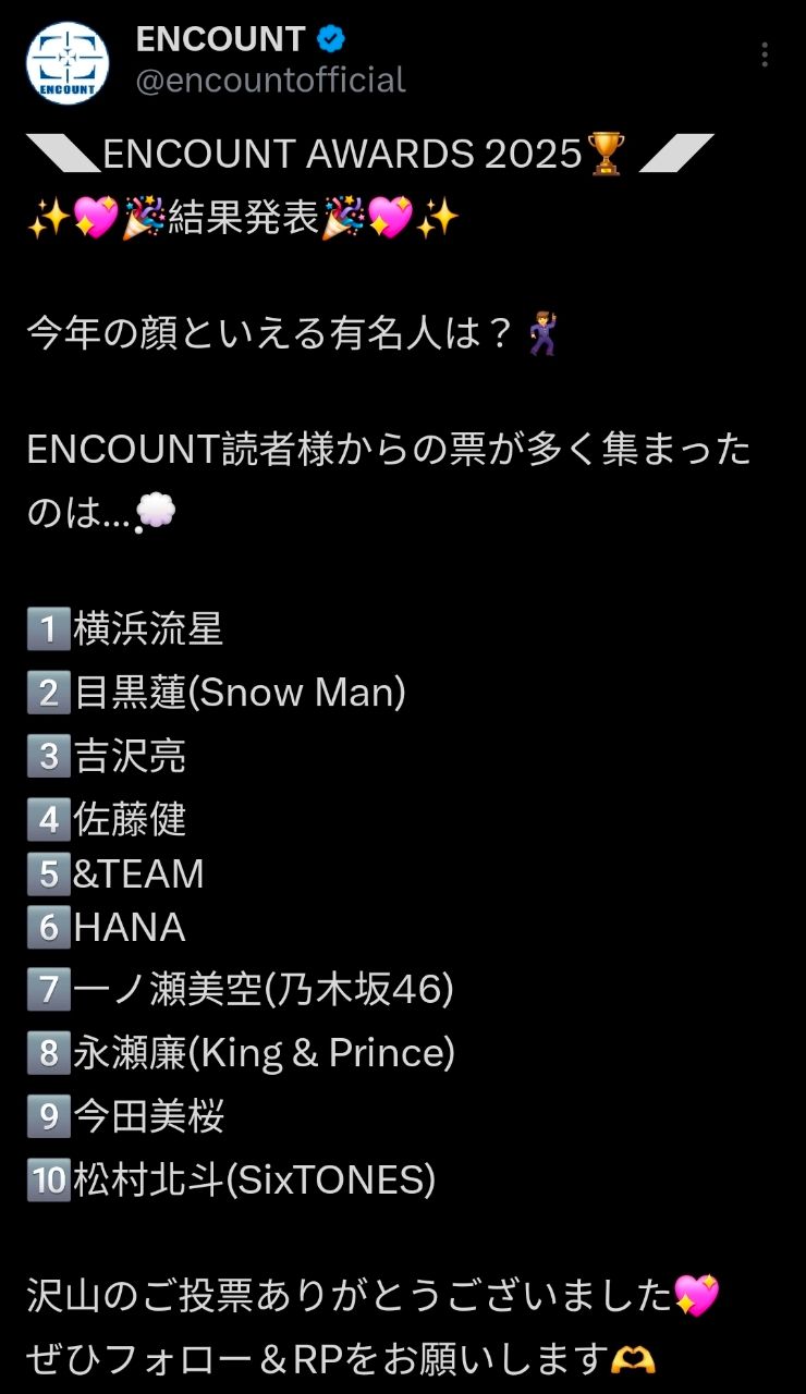 ENCOUNT在日前舉辦了「今年の顔といえる有名人は?」(今年代表性人物)投票