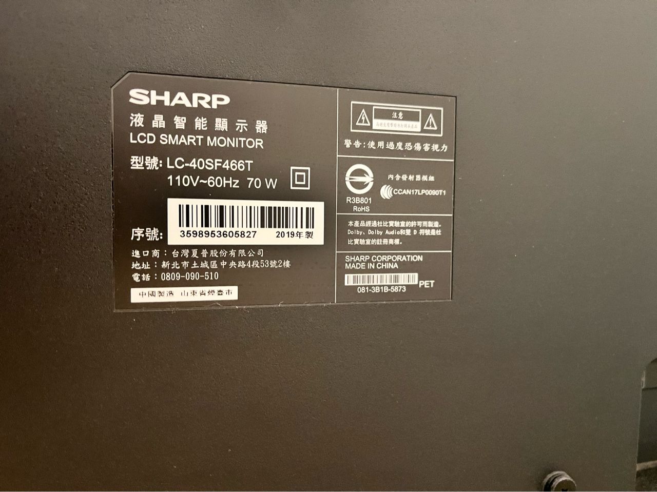 名稱:40吋 Sharp 智能電視