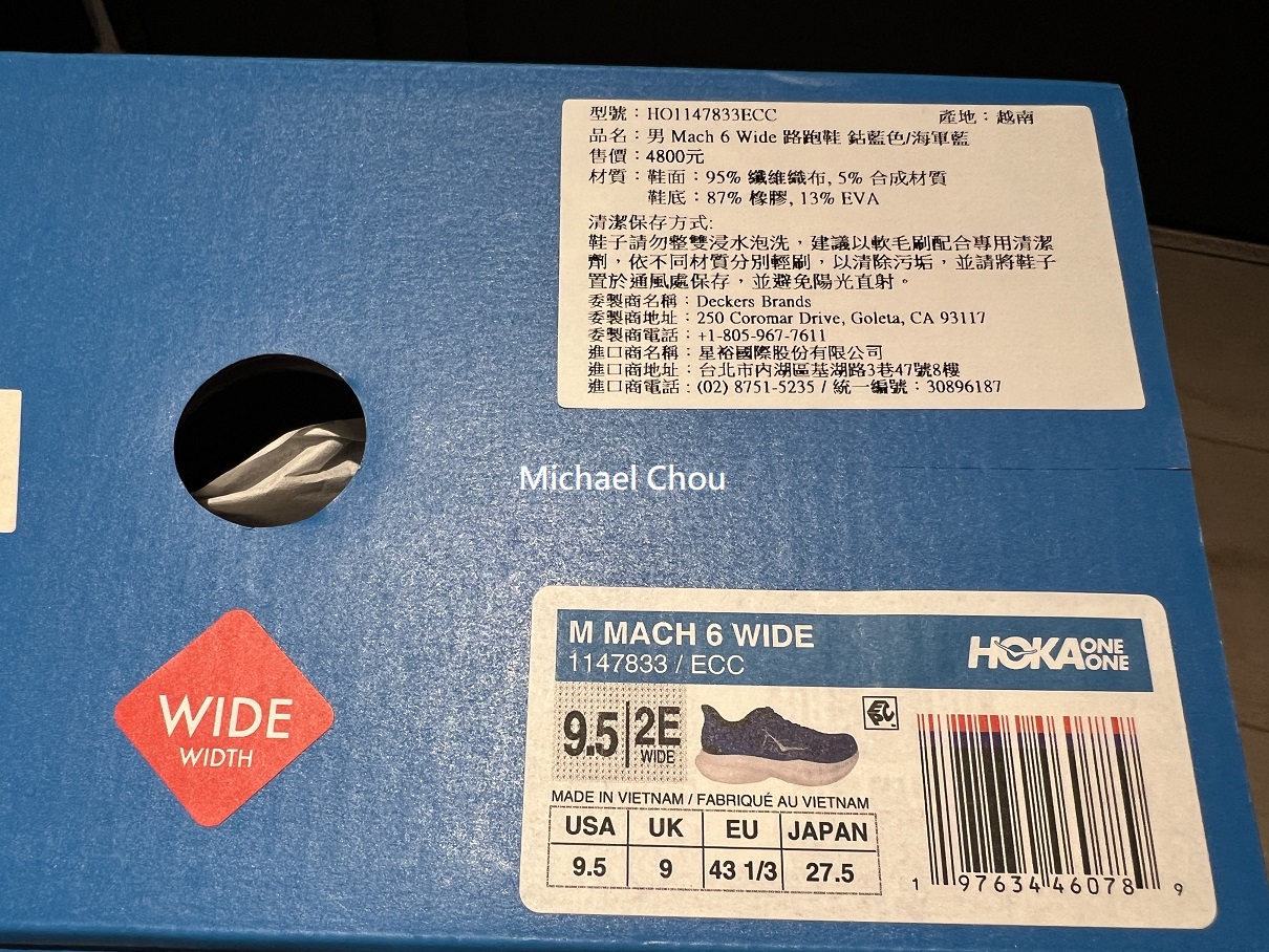 (1) 商品名稱: Hoka Mach 6 US9.5 2E寬楦