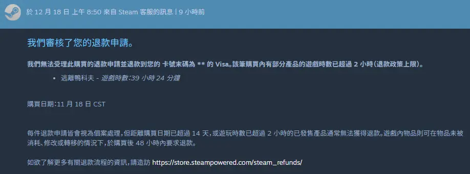 77F:推 lordmi: 我提給Steam退款文件是寫製作組的問題違反了服務條款,mo 12/18 21:02