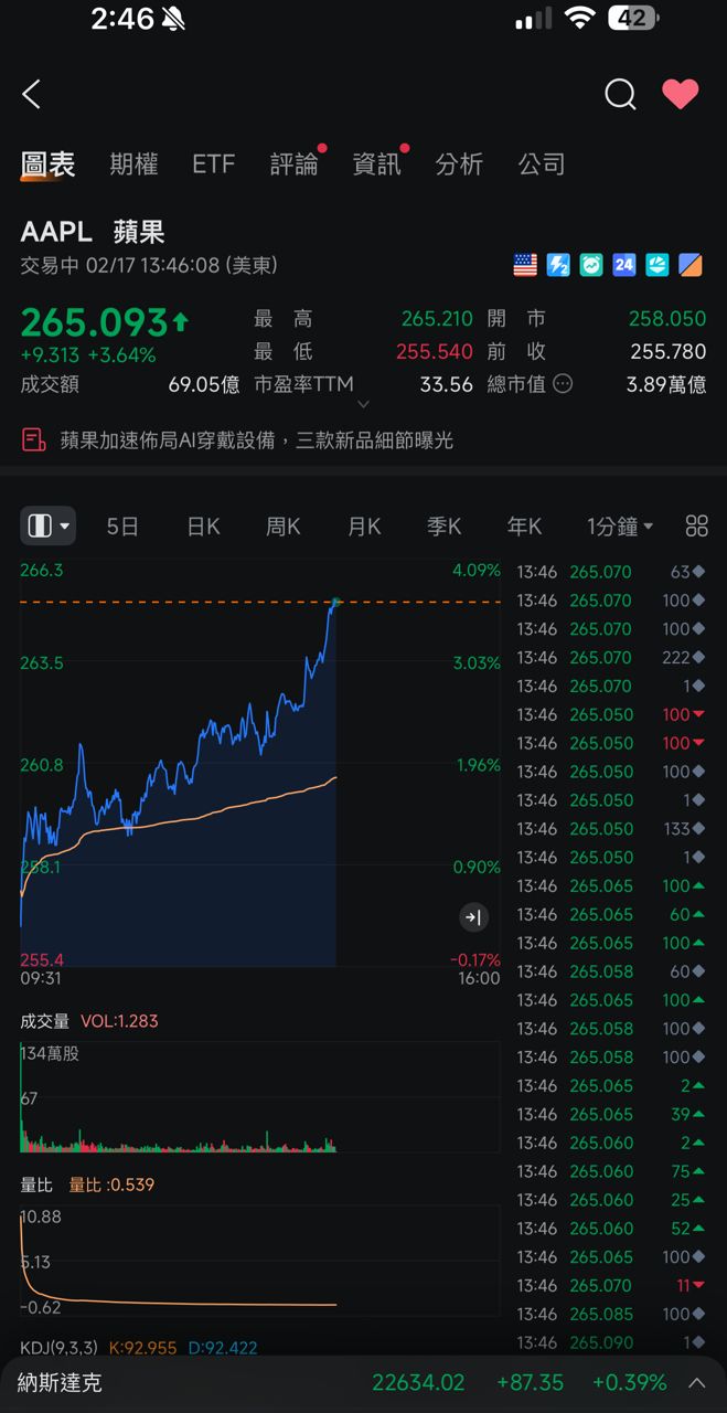 那斯達克 22546.67 ▼ 50.48 (-0.22%)