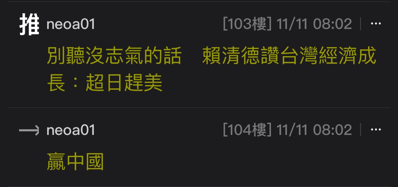 7F:→ neoa01: 故因引用賴總統講述台灣經濟好的新聞標題,平衡該篇報導 11/17 10:59