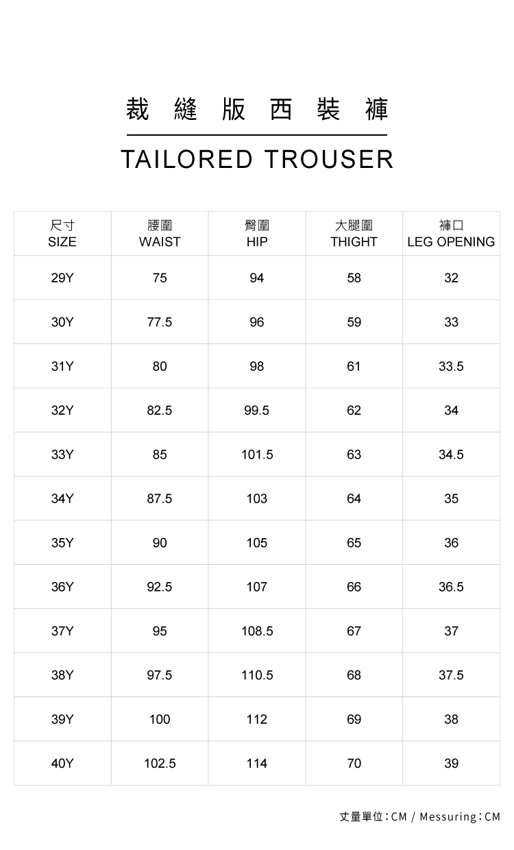 m(30腰)腰圍 79/臀圍 109/上襠 26/大腿寬 34.5/褲腳寬 20.5/褲長需自行修改