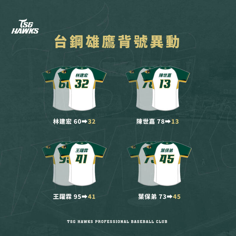 選手有4人背號異動,投手林建宏由60號改為32號、王躍霖由95號改為41號,捕手陳世嘉