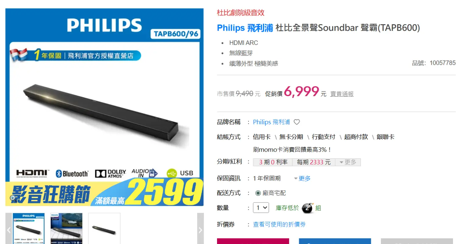 商品名稱:Philips 飛利浦 杜比全景聲Soundbar 聲霸(TAPB600)
