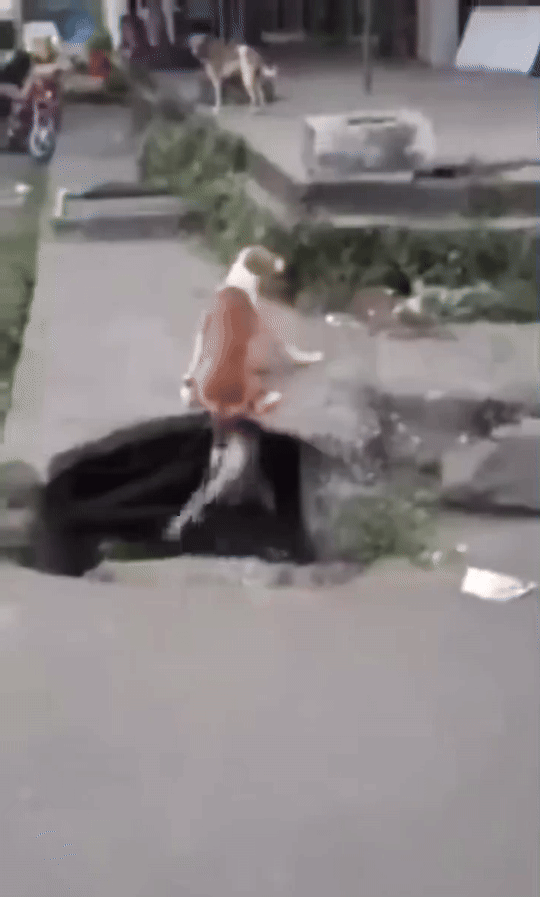 起初他不怎麼在意,但兩隻狗突然跌到坑中,