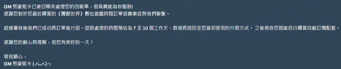 98F:→ hydra3179: 成續訂拿獎勵,GM直接幫我退費。謝謝,GM 努豪妮卡。 11/26 20:17