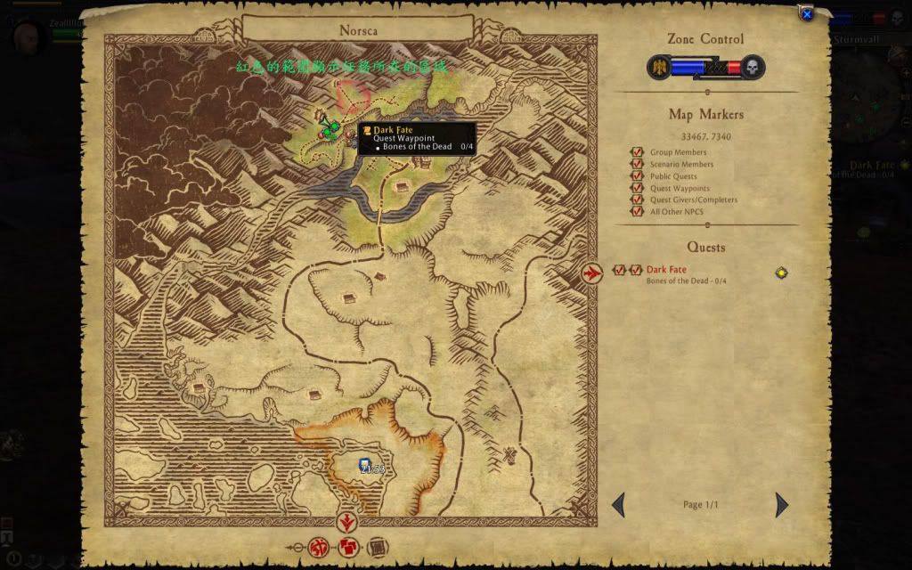,你會注意到 地圖上會出現紅色的區域,那是進行任務所在的地方,游標移過去會自動 顯示完成條件,點擊任務名稱也會跳出詳細內容;完成任務後,找尋頭像 上有黃色標誌的交還任務。