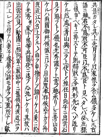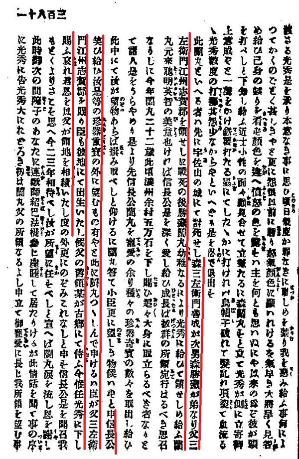 秀領有還是毛利家的出雲、石見兩國這項紀述外,還敘述織田信長寵信的近侍森蘭丸向織