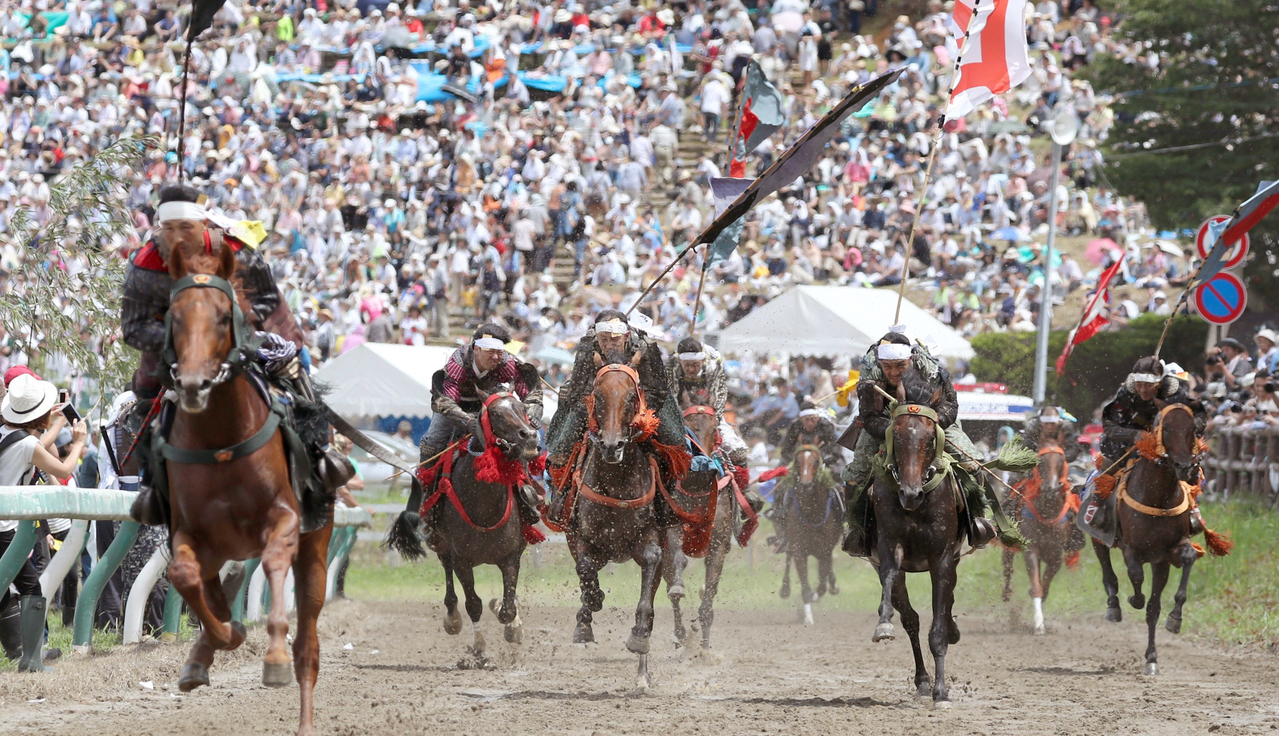 隔天,在雲雀之原祭場則會舉辦「甲冑競馬」,在1公里長的馬場上,10-12名騎著快馬的甲冑武士將競速10圈,以選出當年度最優秀的騎士;之後還有「神旗爭奪戰」,主辦單位會用煙火把40張御神旗社到空中,而草場上的數百名騎馬武士則要拼命地爭搶飄落的旗子,人馬雜沓的景象,也如同戰國合戰的千年再現。