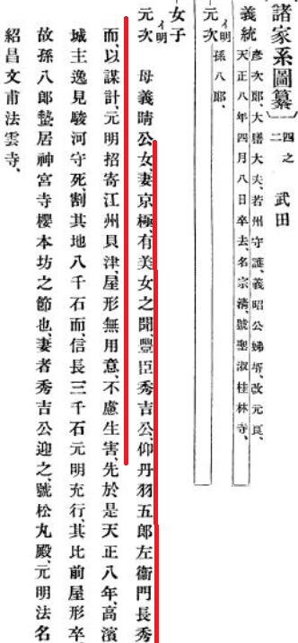 以『諸家系圖纂』一書的紀錄來參考,武田元明是因為妻子京極氏有美女之名,秀吉透過