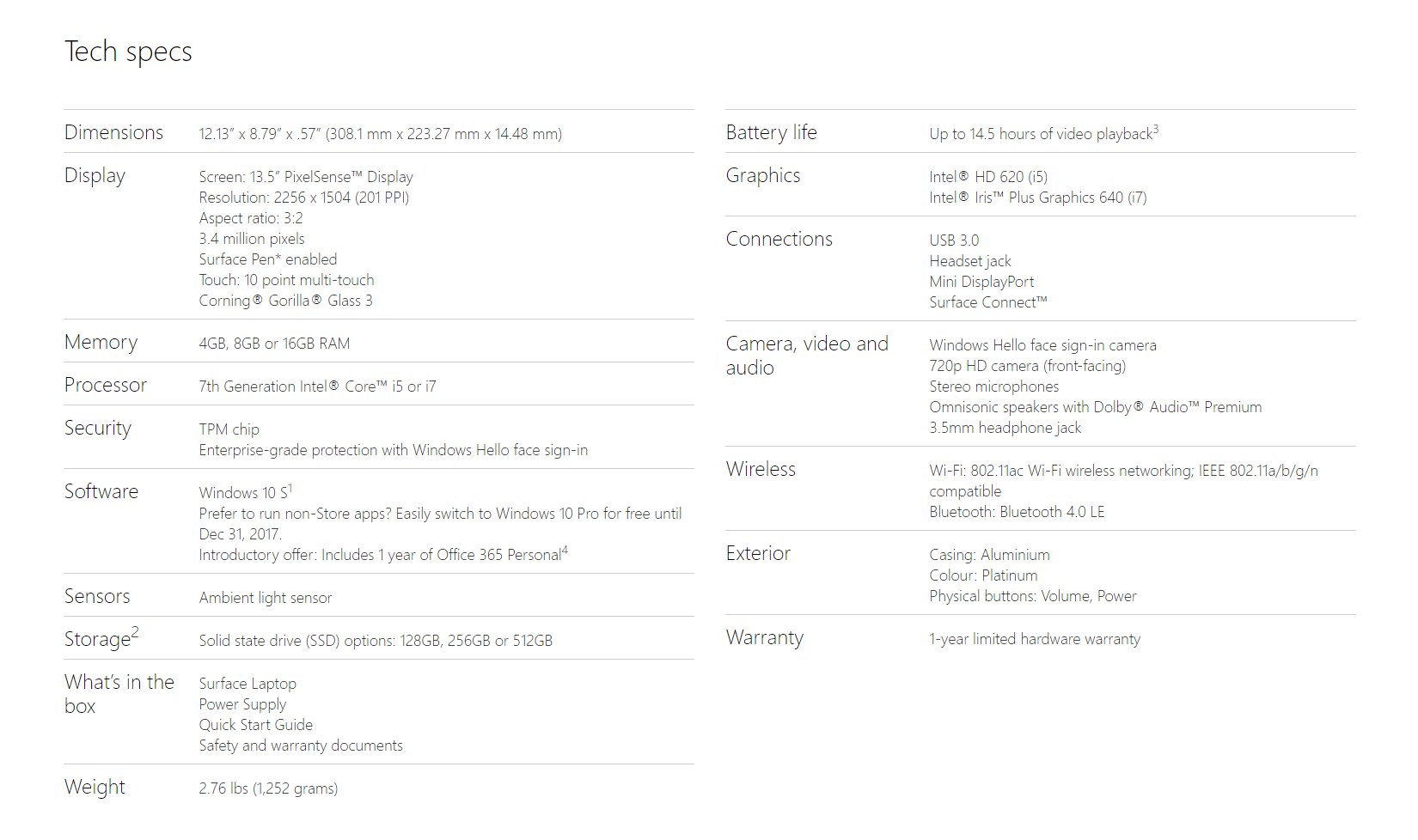 在推特上看到的Surface Laptop規格表
