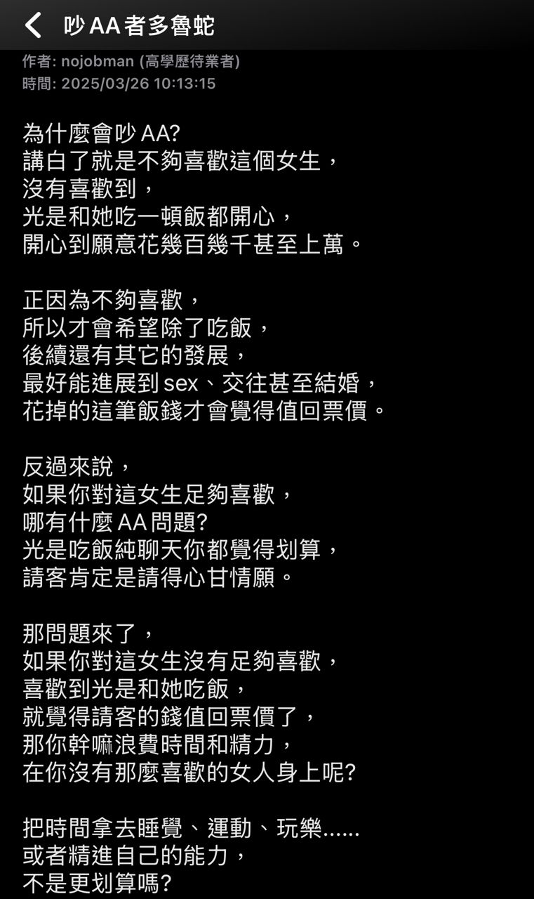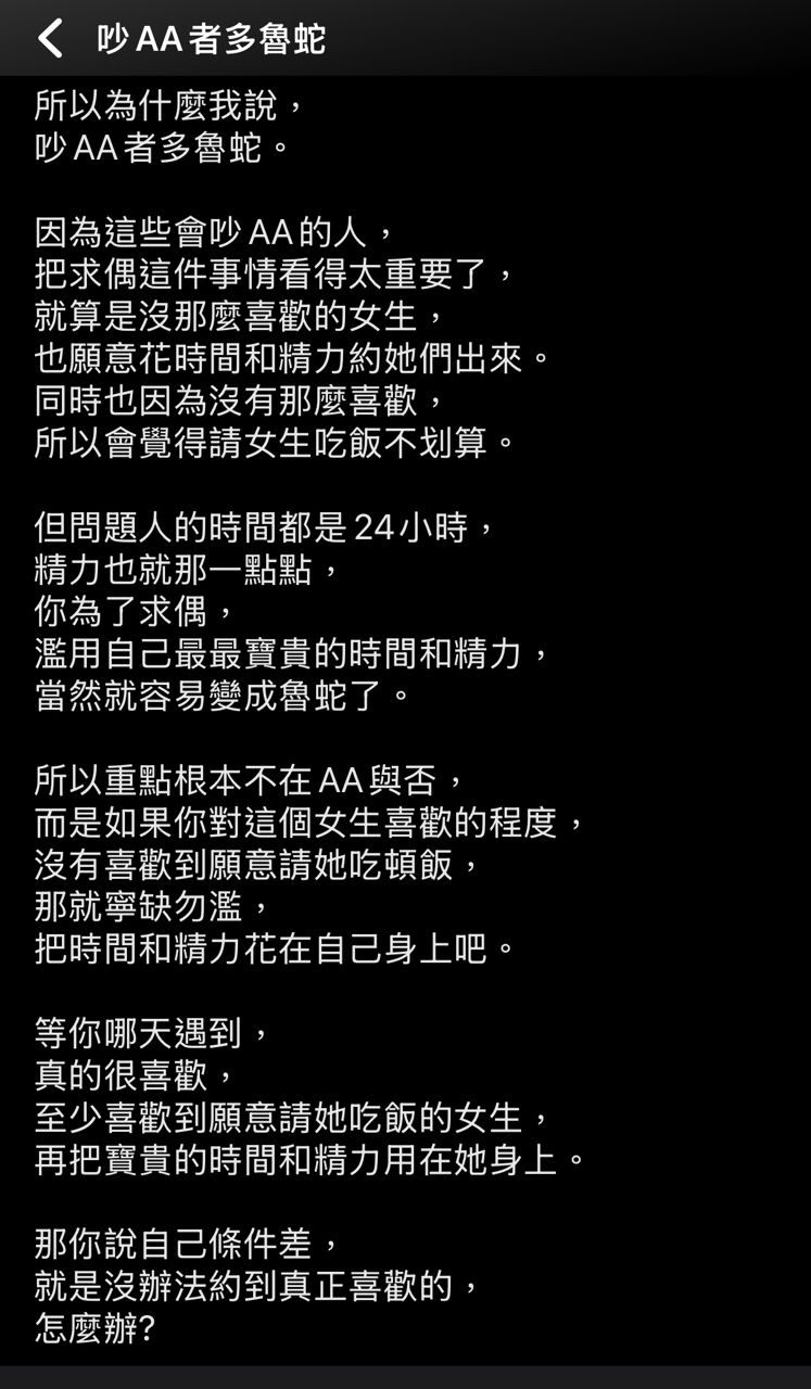 20F:→ DogCavy : 我也覺得男人要AA就是沒那麼喜歡42.71.92.57 02/13 09:13