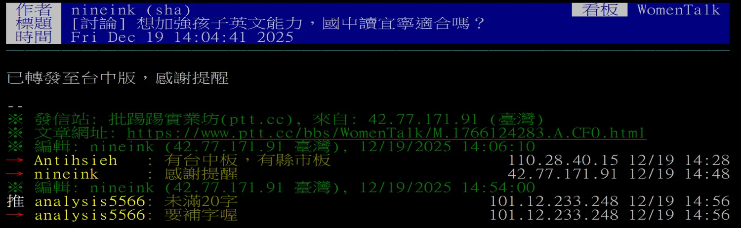 B. 禁止發表不足20字繁體字(無意義湊字數不計入)或電腦觀看僅一行之文章。