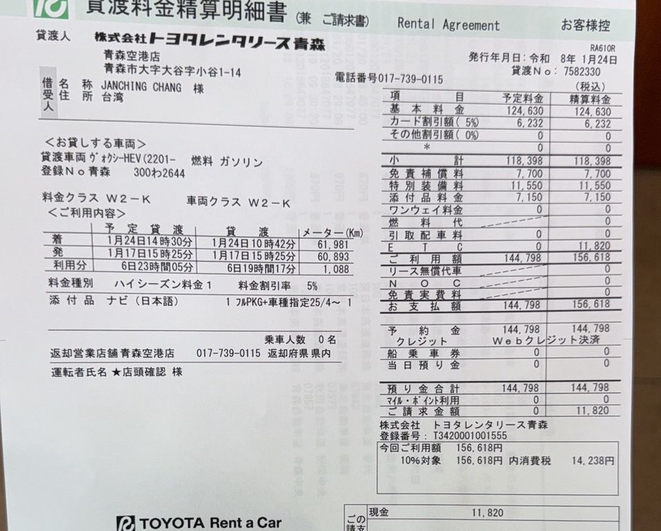 這次指定車型與安心租車保險方案,租車費用日幣144798元,換算台幣29580元,交車時