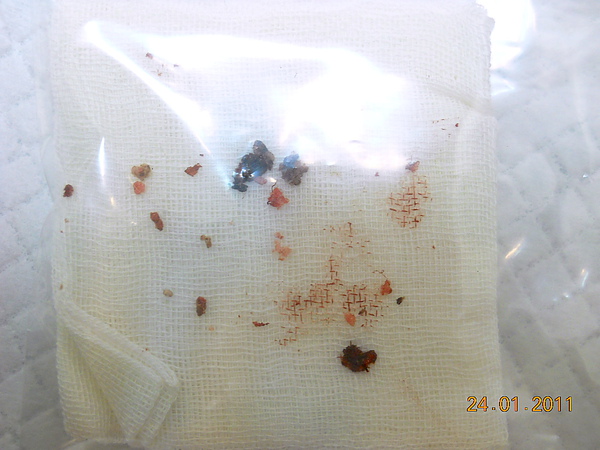 ↓手術取出的結石與顆粒