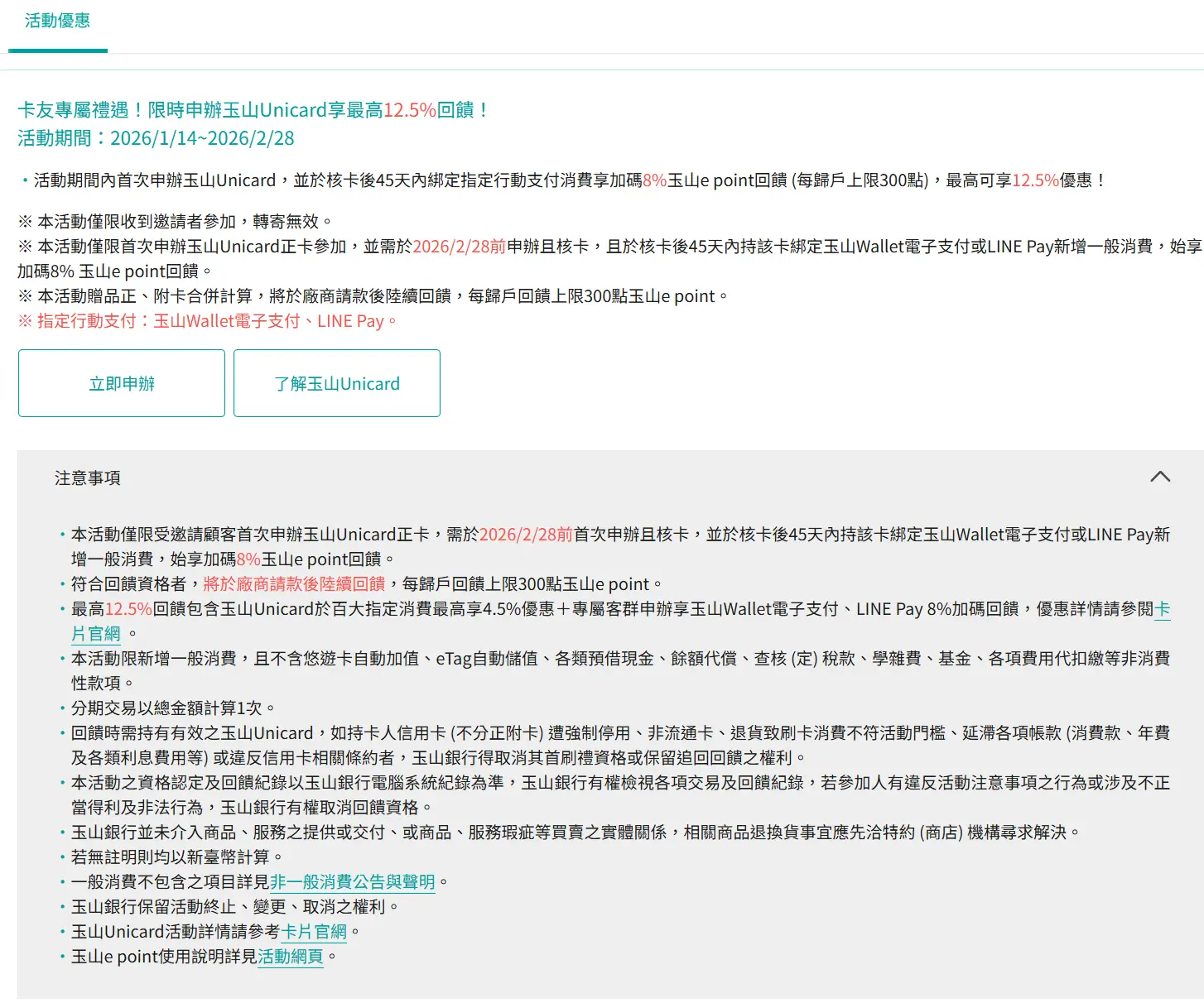 ※ 本活動僅限首次申辦玉山Unicard正卡參加,並需於2026/2/28前申辦且核卡,且於核