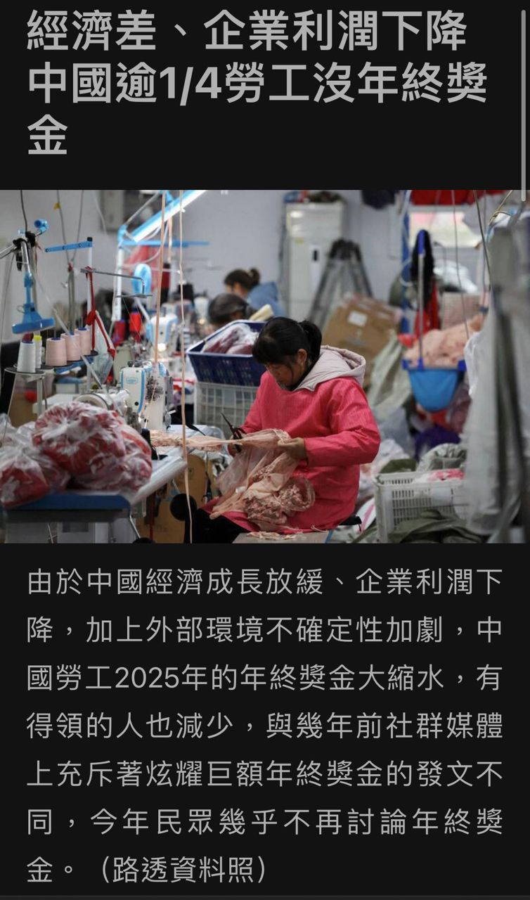 38F:→ analysis5566: 經濟差、企業利潤下降 中國逾1/4勞工沒年終獎金 02/17 23:34
